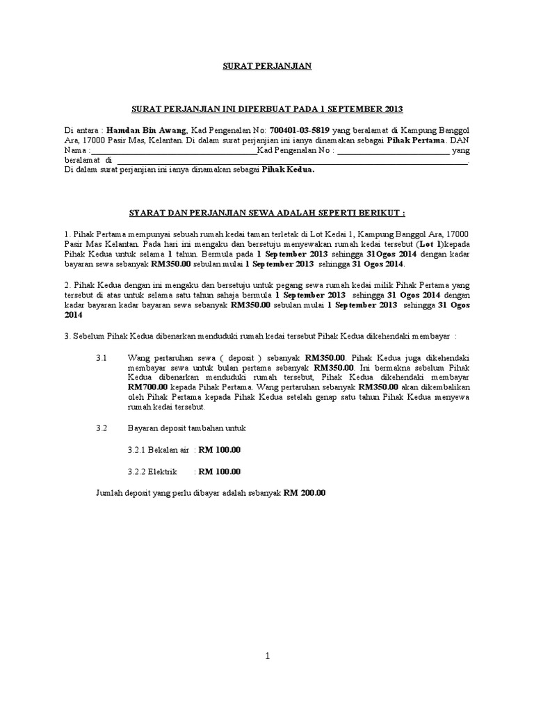 Disertakan sekali Template dalam Microsoft Word dan mudah di edit semula. 10 contoh surat perjanjian sewa kontrak rumah yang baik dan. Bayaran sewa rumah kedai hendaklah dijelaskan oleh Pihak Kedua kepada Pihak Pertama pada setiap.